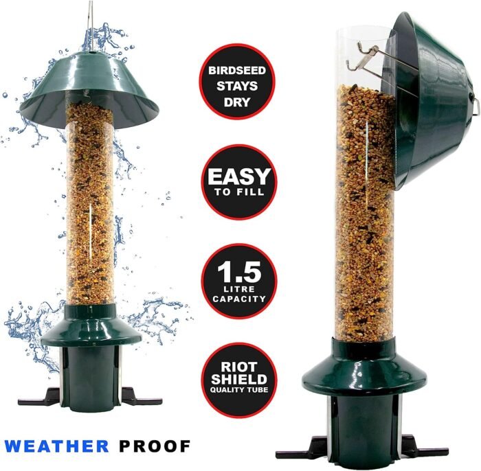 - SO SIMPLE TO USE AND FILL – Simply open the lid and fill. No need to take the whole feeder apart to fill. The PestOff bird feeder simply ‘clicks’ apart for easy cleaning, no nuts and bolts to remove and replace. Seed container is made from thick UV stable Polycarbonate.